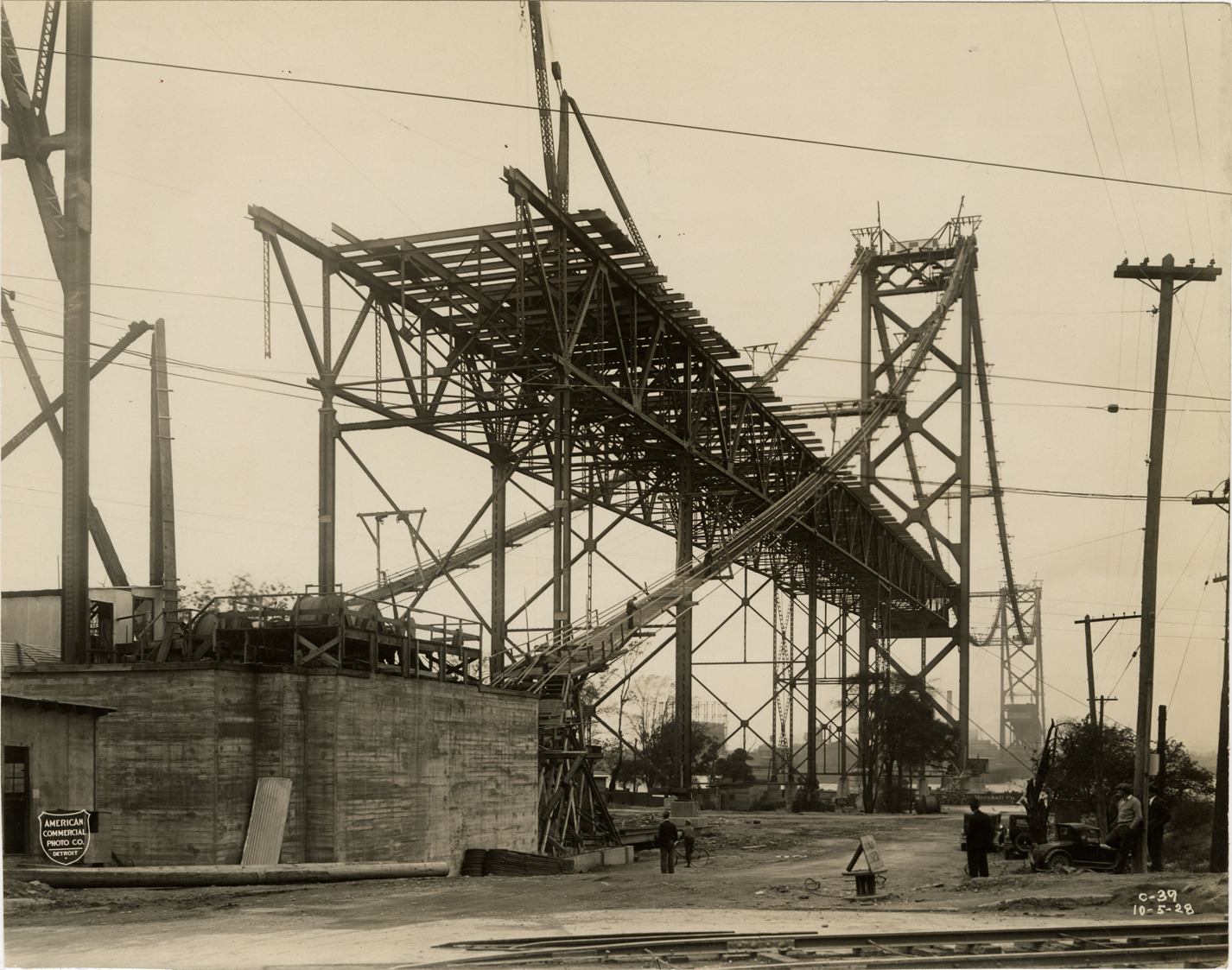 Favorite this☆ Ambassador Bridge during construction Description: View of the Ambassador Bridge during construction. Printed on front: "American Commercial Photo Co., Detroit. C-39, 10-5-28." Details Resource ID: bh024435 Creator: American Commercial Photo Co. Subject: Ambassador Bridge (Detroit, Mich., and Windsor, Ont.) Suspension bridges--Design and construction McClintic-Marshall Construction Company Photographers--Michigan--Detroit Photographic prints Date Issued: 1928-10-05 Format: 1 photographic print mounted on fabric ; 7.5 x 9.5 in. Member of: Burton Historical Collection Filing Location: D/Bridges-Ambassador-Construction-October 1928 Rights: Physical rights are retained by DPL. Copyright is retained in accordance with U.S. copyright laws.