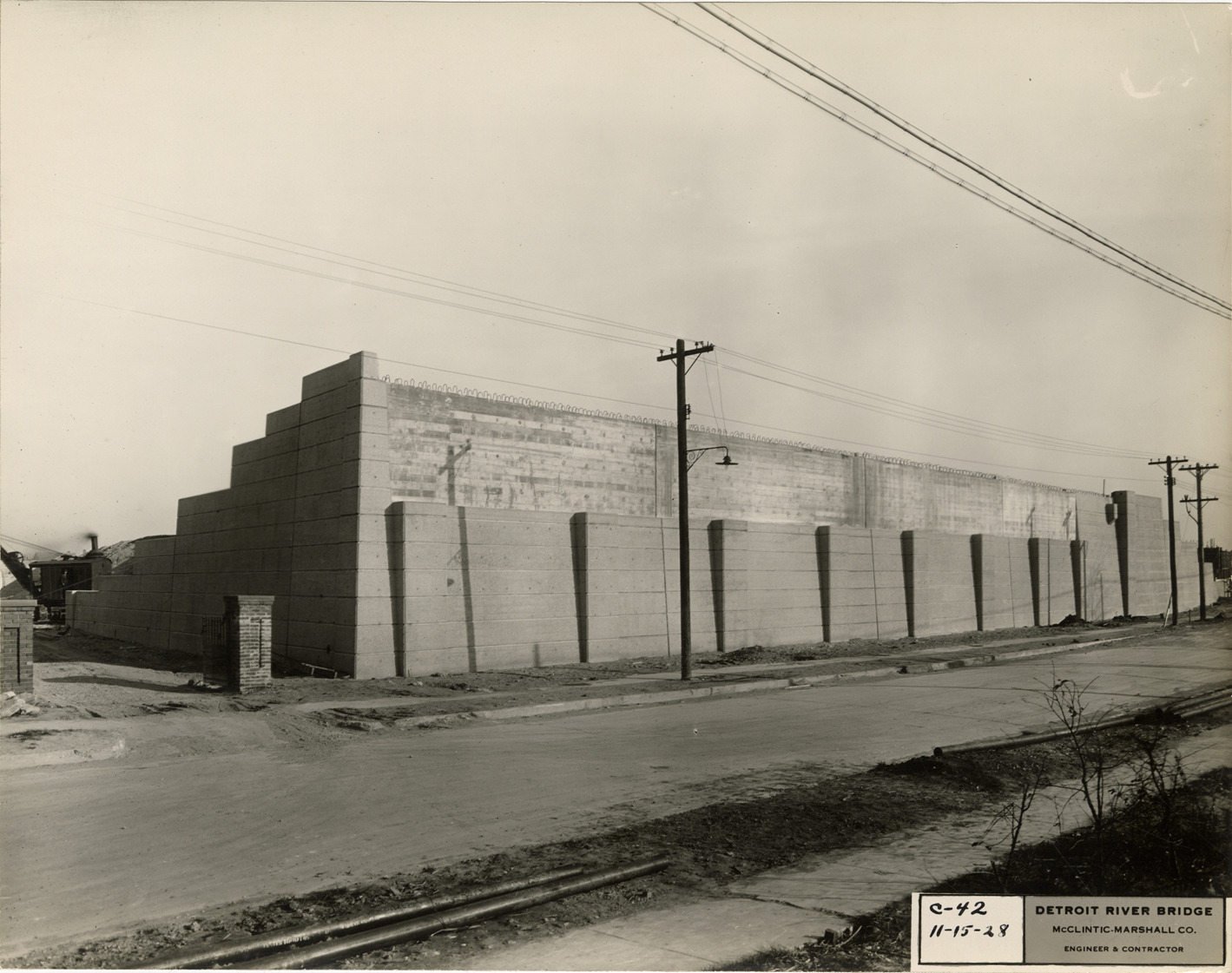 View of an unidentified concrete structure, Ambassador Bridge during construction. Printed on front: "C-42, 11-15-28. Detroit River Bridge, McClintic-Marshall Co., engineer & contractor."