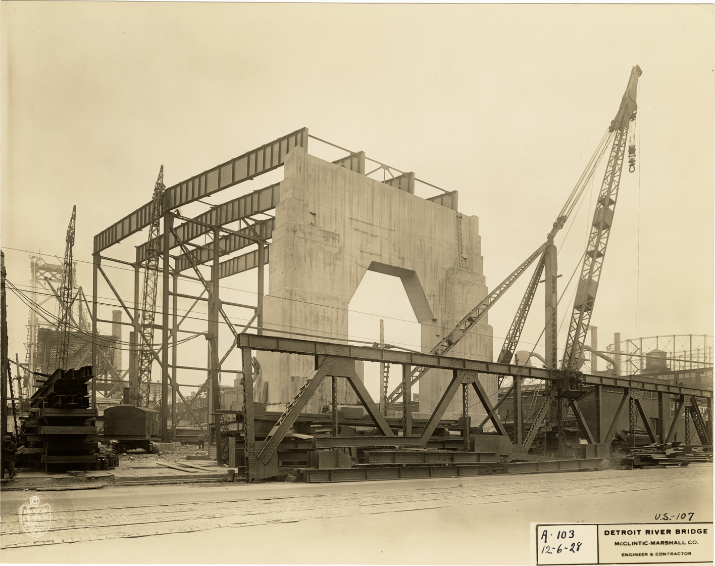 View of a concrete anchorage, Ambassador Bridge during construction. Printed on front: "[copyright] American Commercial Photo Co., Detroit, 1928. U.S.-107, A-103, 12-6-28. Detroit River Bridge, McClintic-Marshall Co., engineer & contractor."