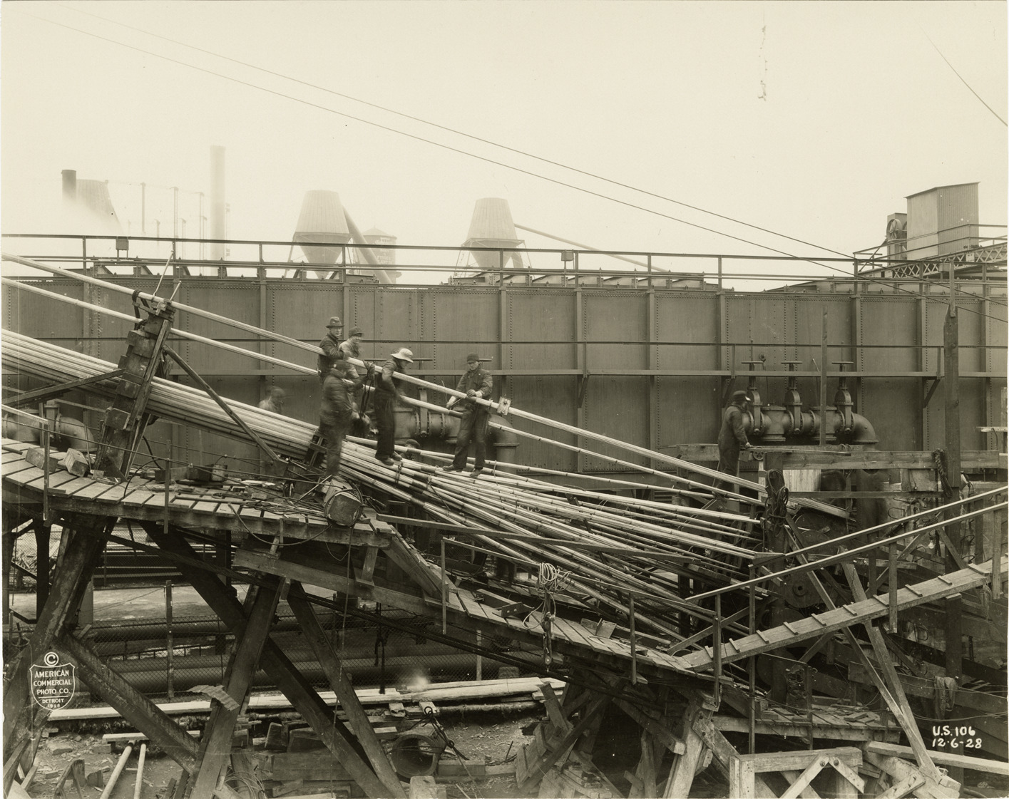 View of workers installing cables at United States anchorage, Ambassador Bridge during construction. Printed on front: "[copyright] American Commercial Photo Co., Detroit. U.S. 106, 12-6-28."