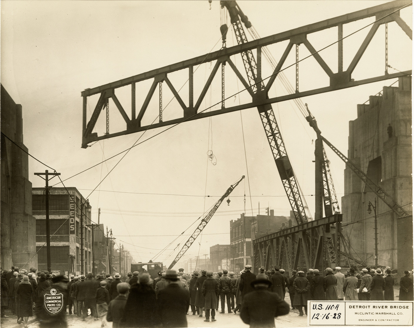 Favorite this☆ Crowd watching Ambassador Bridge construction Description: View of a crowd watching the construction of the Ambassador Bridge. Cranes in background. Printed on front: "[copyright] American Commercial Photo Co., Detroit, 1928. US-110-A, 12-16-28." Details Resource ID: bh024458 Creator: American Commercial Photo Co. Subject: Ambassador Bridge (Detroit, Mich., and Windsor, Ont.) Suspension bridges--Design and construction Crowds Cranes, derricks, etc. McClintic-Marshall Construction Company Photographers--Michigan--Detroit Photographic prints Date Issued: 1928-12-16 Format: 1 photographic print mounted on fabric ; 7.5 x 9.5 in. Member of: Burton Historical Collection Filing Location: D/Bridges-Ambassador-Construction-December 1928 Rights: Physical rights are retained by DPL. Copyright is retained in accordance with U.S. copyright laws.