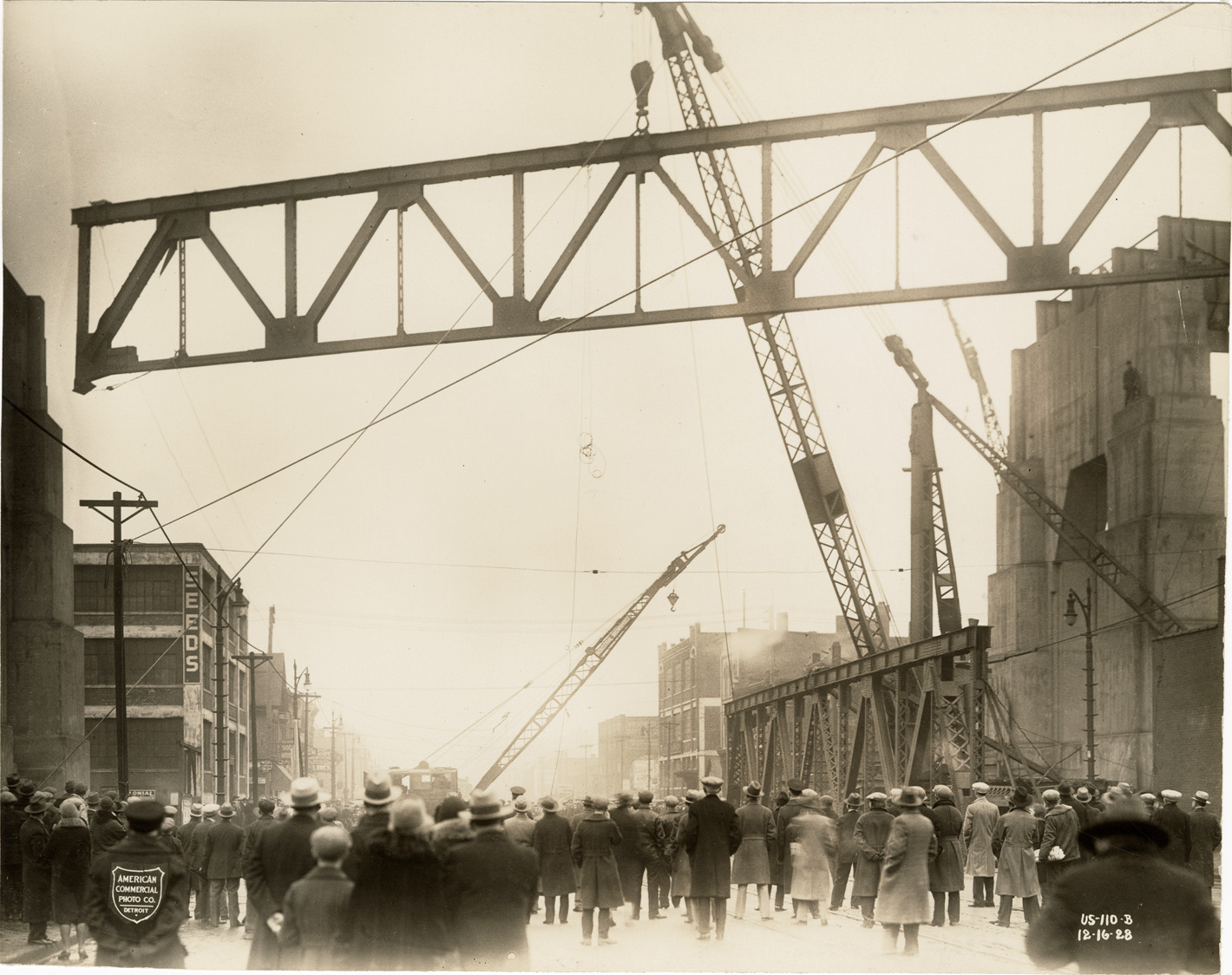 View of a crowd watching the construction of the Ambassador Bridge. Cranes in background. Printed on front: "American Commercial Photo Co., Detroit. US-110-B, 12-16-28."