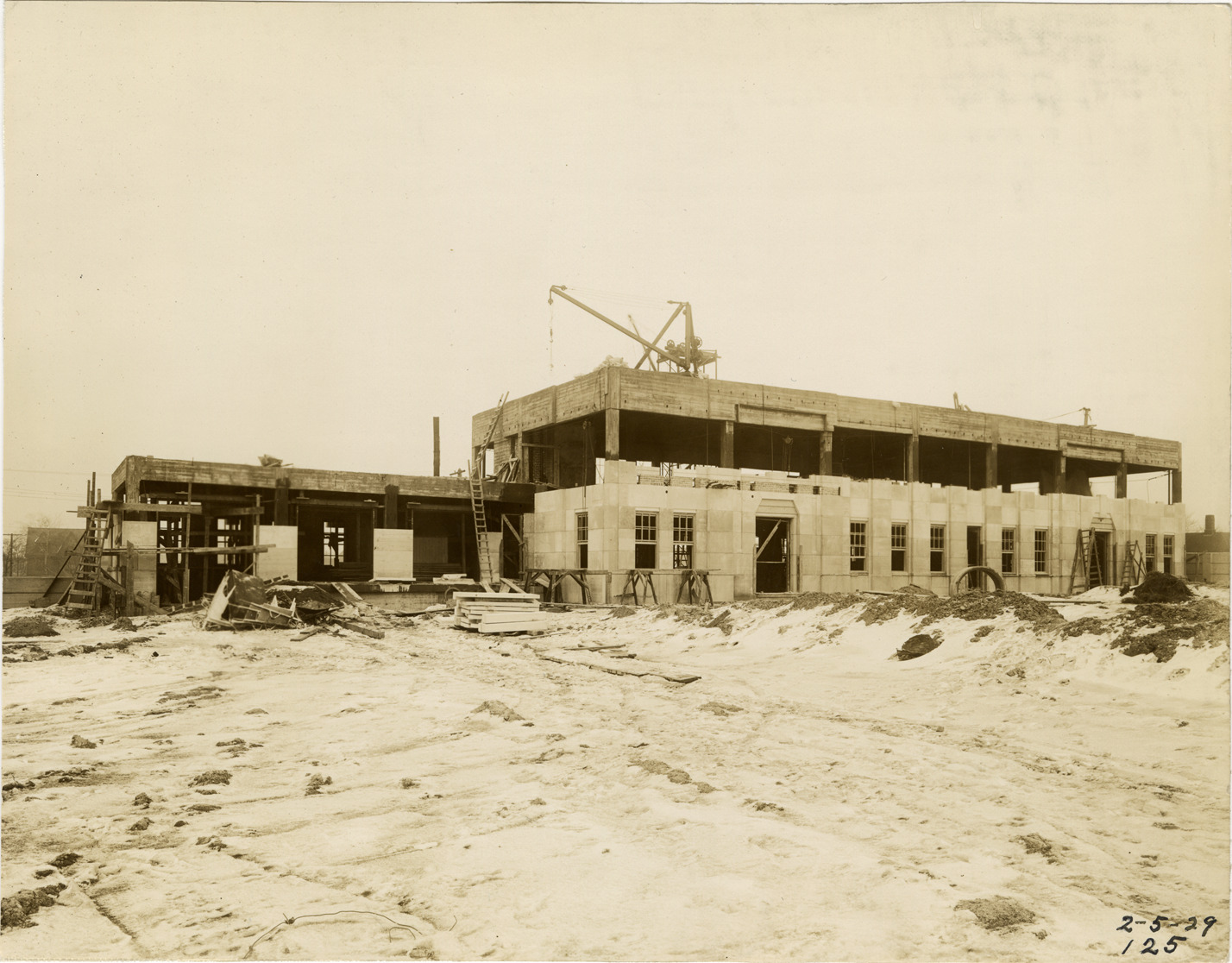 View of an unidentified building for Ambassador Bridge during construction. Printed on front: "2-5-29, 125."