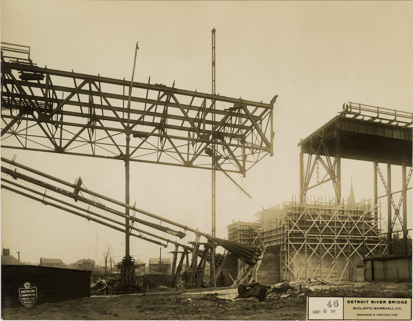 Favorite this☆ Ambassador Bridge during construction Description: Close-up view of the Ambassador Bridge during construction. Printed on front: "[copyright] American Commercial Photo Co., Detroit, 1929. 46, Mar 6, '29. Detroit River Bridge, McClintic-Marshall Co., engineer & contractor." Details Resource ID: bh024479 Creator: American Commercial Photo Co. Subject: Ambassador Bridge (Detroit, Mich., and Windsor, Ont.) Suspension bridges--Design and construction McClintic-Marshall Construction Company Photographers--Michigan--Detroit Photographic prints Date Issued: 1929-03-06 Format: 1 photographic print mounted on fabric ; 7.5 x 9.5 in. Member of: Burton Historical Collection Filing Location: D/Bridges-Ambassador-Construction-January/March 1929 Rights: Physical rights are retained by DPL. Copyright is retained in accordance with U.S. copyright laws.
