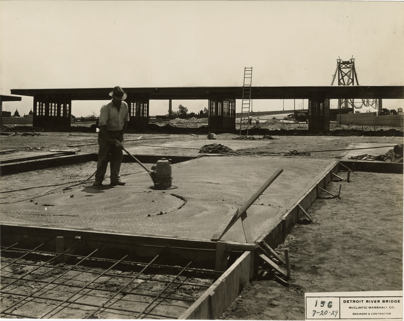View of a worker sanding concrete pavement, Ambassador Bridge during construction. Printed on front: "156, 7-20-29. Detroit River Bridge, McClintic-Marshall Co., engineer & contractor." Stamped on back: "American Commercial Photo Co., 25 Parsons St., Detroit, Mich. Glendale 7152."