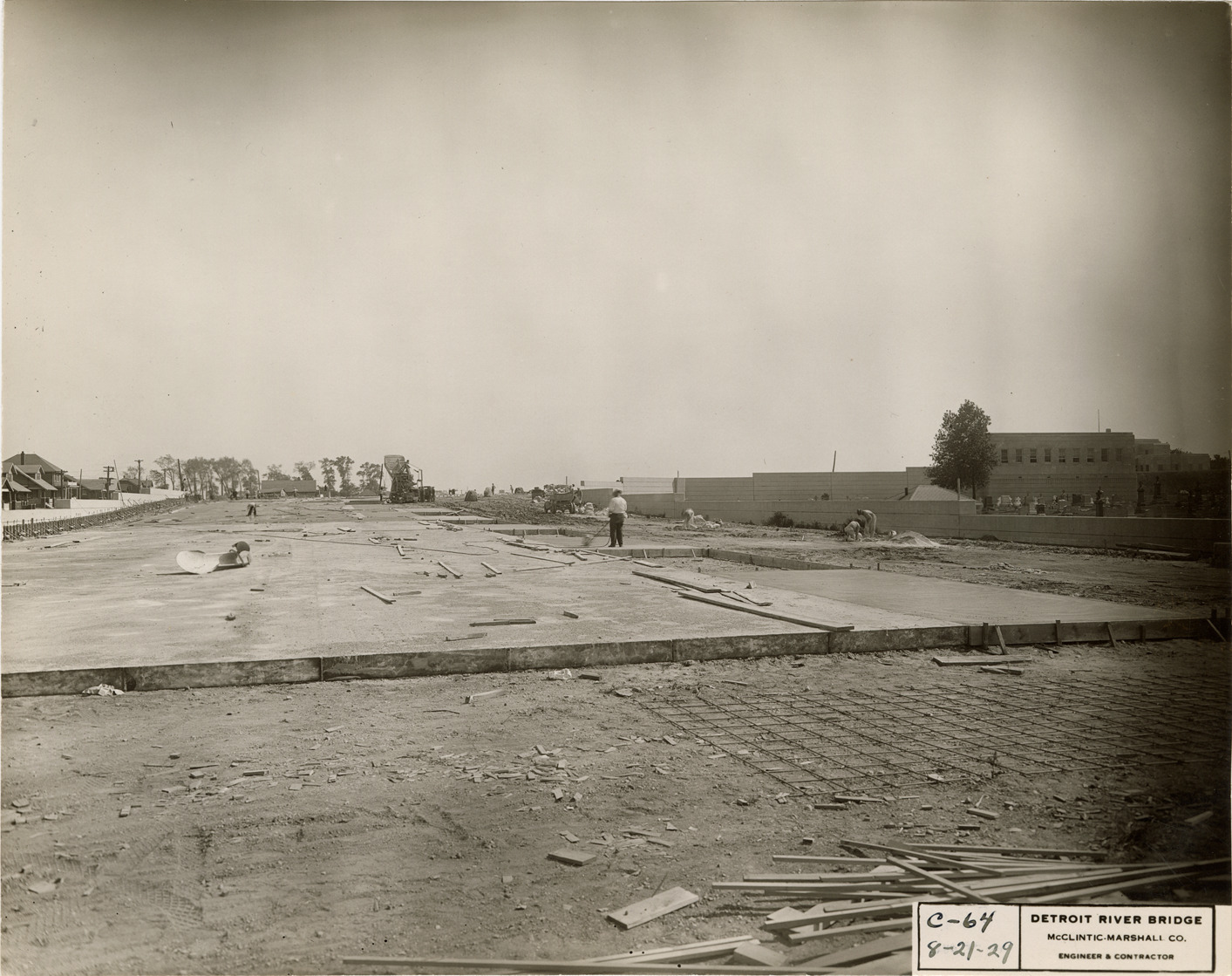 View of workers installing concrete road, Ambassador Bridge during construction. Printed on front: "C-64, 8-21-29. Detroit River Bridge, McClintic-Marshall Co., engineer & contractor."