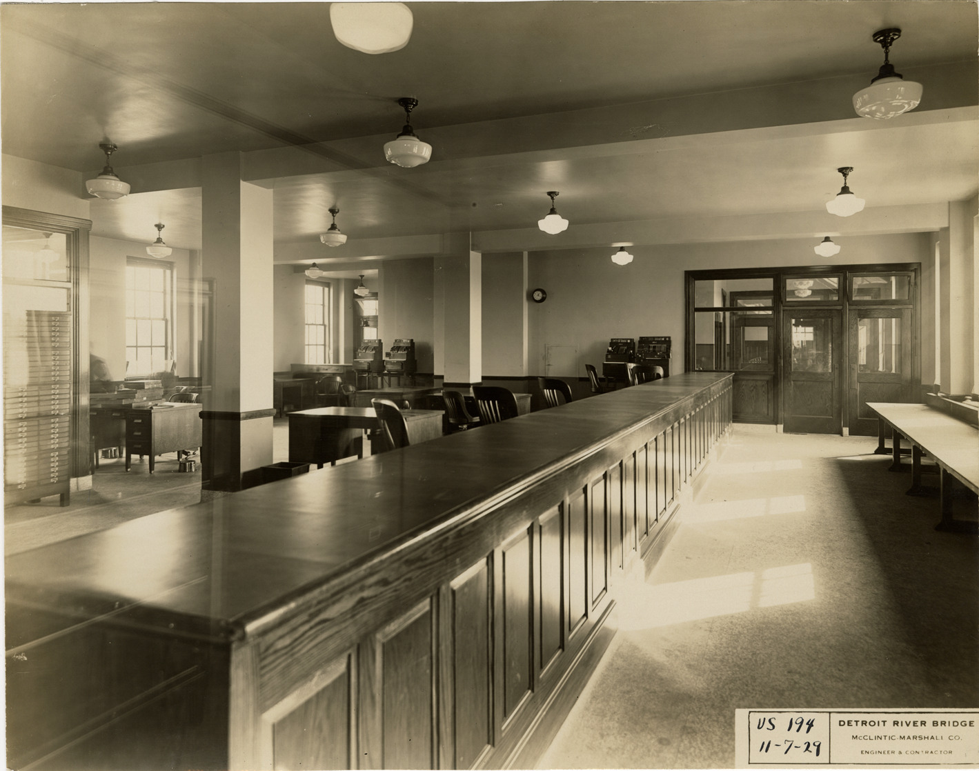 Interior view of the U.S. Customs office, Ambassador Bridge during construction. Desks and chairs are visible behind wooden counter. Printed on front: "US 194, 11-7-29, Detroit River Bridge, McClintic-Marshall Co., engineer & contractor."
