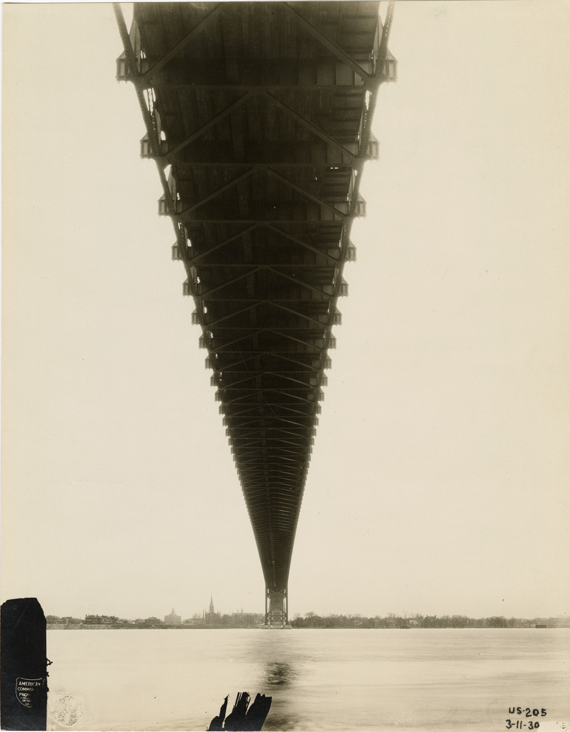 Favorite this☆ Ambassador Bridge Description: View of the underside of the Ambassador Bridge. Printed on front: "American Commercial Photo Co., Detroit, 1928 [sic]. US-205, 3-11-30." Details Resource ID: bh024554 Creator: American Commercial Photo Co. Subject: Ambassador Bridge (Detroit, Mich., and Windsor, Ont.) Suspension bridges McClintic-Marshall Construction Company Photographers--Michigan--Detroit Photographic prints Date Issued: 1930-03-11 Format: 1 photographic print mounted on fabric ; 9.5 x 7.5 in. Member of: Burton Historical Collection Filing Location: D/Bridges-Ambassador-January/March, 1930 Rights: Physical rights are retained by DPL. Copyright is retained in accordance with U.S. copyright laws.