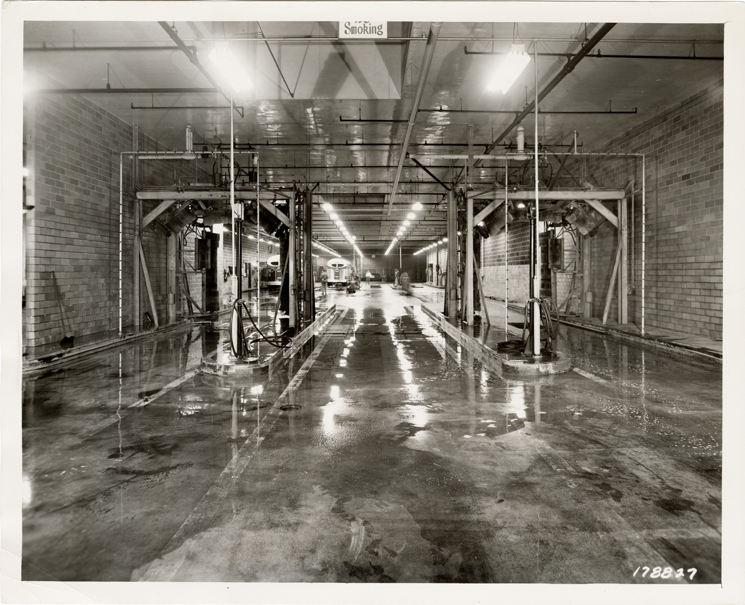 View of Greyhound buses inside the Greyhound garage located on West Fort Street. Vehicle wash area in foreground. Stamped on back: "Manning Bros., commercial photographers, 16300 Brush Street (block south of 6 Mile), Highland Park 3, Mich. Call TO. 8-1092. Schostak Brothers & Co, realtors. 10711 Puritan Ave., Detroit 38, Michigan." Handwritten on back: "Greyhound garage on W. Fort St."
