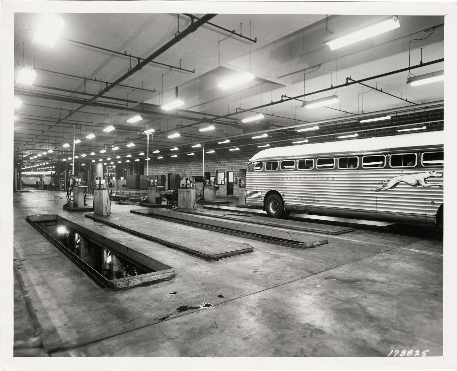 View of Greyhound buses inside the Greyhound garage located on West Fort Street. Stamped on back: "Manning Bros., commercial photographers, 16300 Brush Street (block south of 6 Mile), Highland Park 3, Mich. Call TO. 8-1092. Schostak Brothers & Co, realtors. 10711 Puritan Ave., Detroit 38, Michigan." Handwritten on back: "Greyhound garage on W. Fort St."