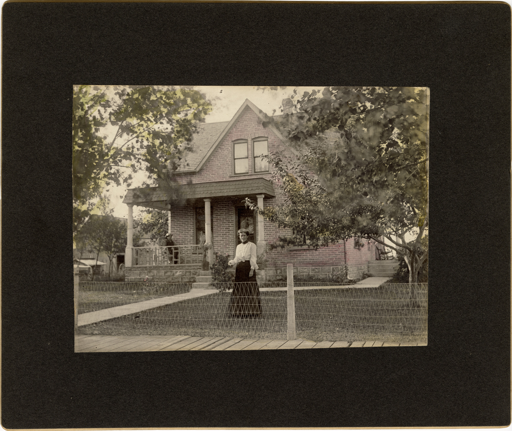 Portrait of a woman posing in front of two-story brick house located on Blaine Ave., the birthplace of Ralzemond D. Parker. Man poses on porch. Handwritten on back: "Blaine Ave., Detroit before 1800."