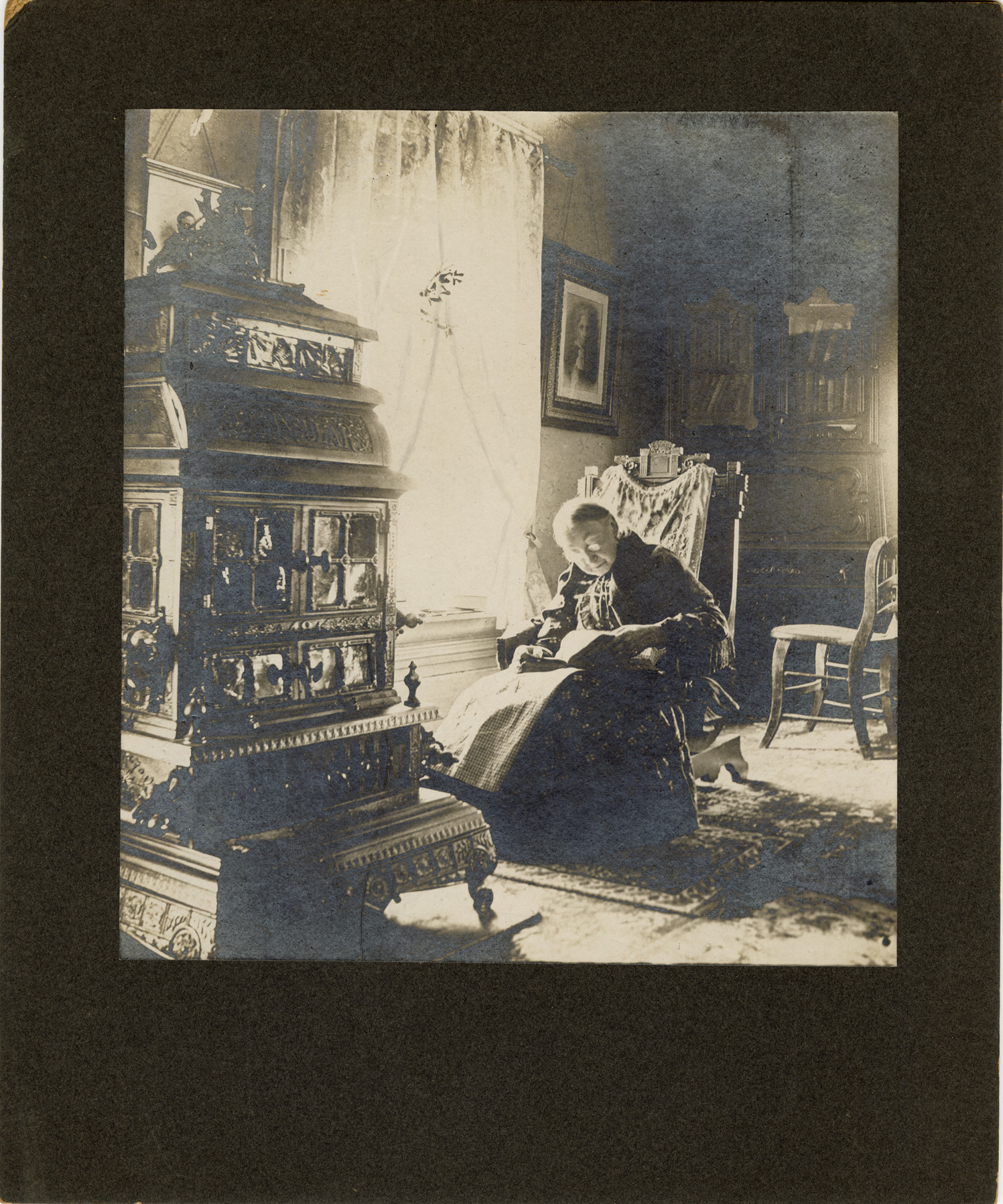 Portrait of Harriet Castle Parker, wife of Asher B. Parker and mother of Ralzemond A. Parker. Parker sits in a chair in front of a stove, reading. Handwritten on back: "Harriet Castle Parker (Mrs. Asher B. Parker). Taken about 1900. Woodward & 13 Mile, Royal Oak."