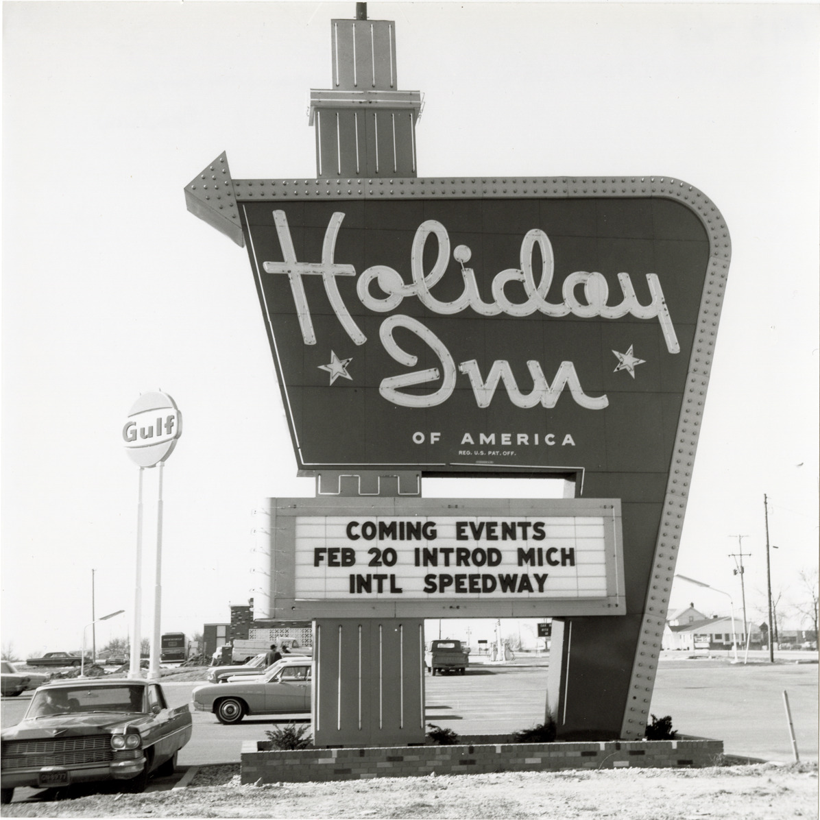 View of a Holiday Inn sign advertising the Michigan International Speedway in Brooklyn, Michigan. Sign reads: "Coming events. Feb. 20. Introd Mich Intl Speedway." Gulf gas station sign in background.