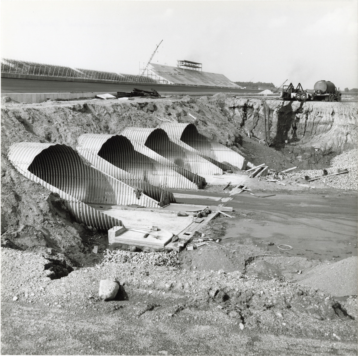View of culverts for the Michigan International Speedway in Brooklyn, Michigan, during construction. Grandstand is visible in background. The Speedway was designed by Charles Moneypenny and built by developer Lawrence H. LoPatin.