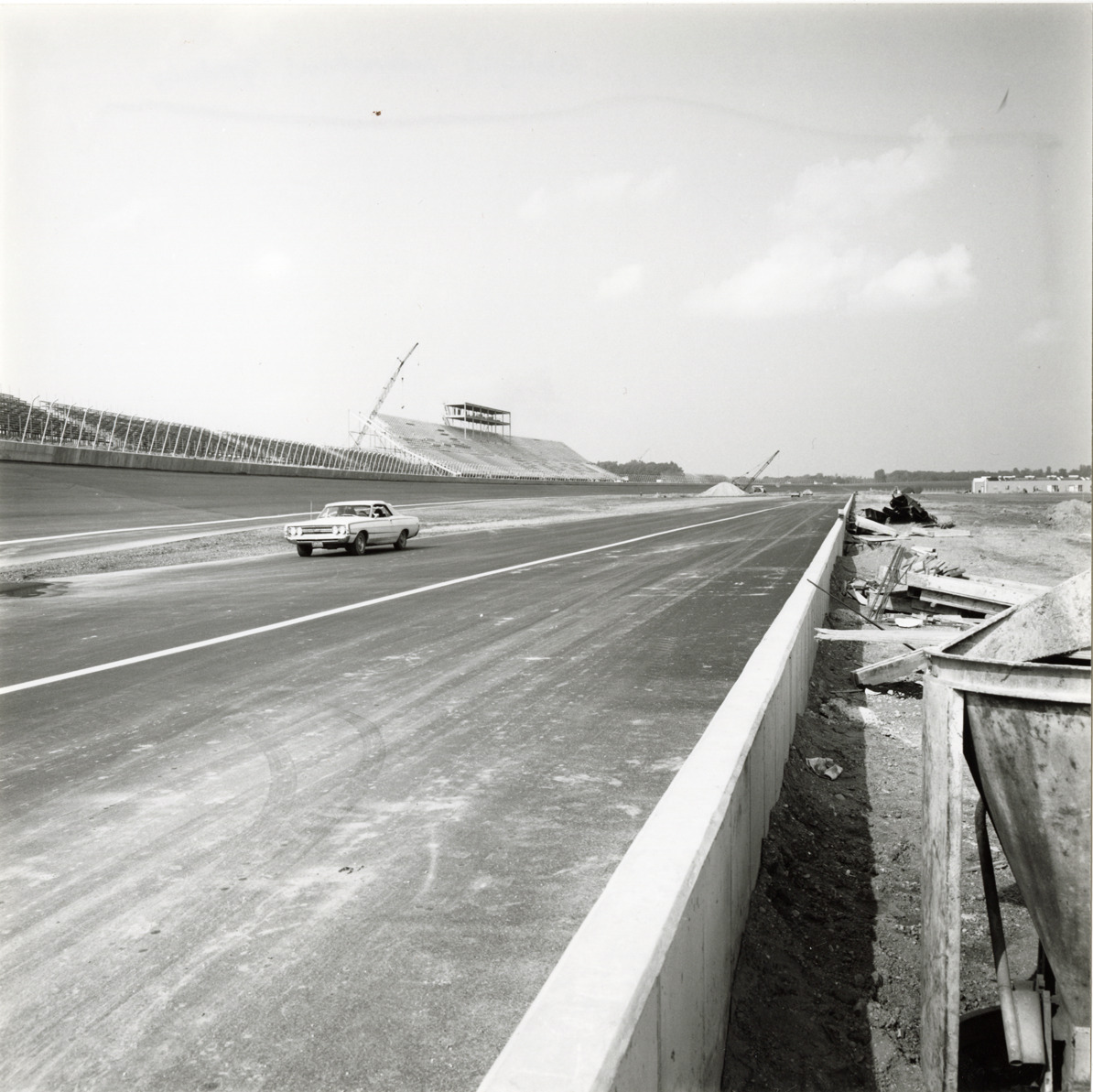 View of a car on the racetrack for the Michigan International Speedway in Brooklyn, Michigan, during construction. Grandstand is visible in background. The Speedway was designed by Charles Moneypenny and built by developer Lawrence H. LoPatin.