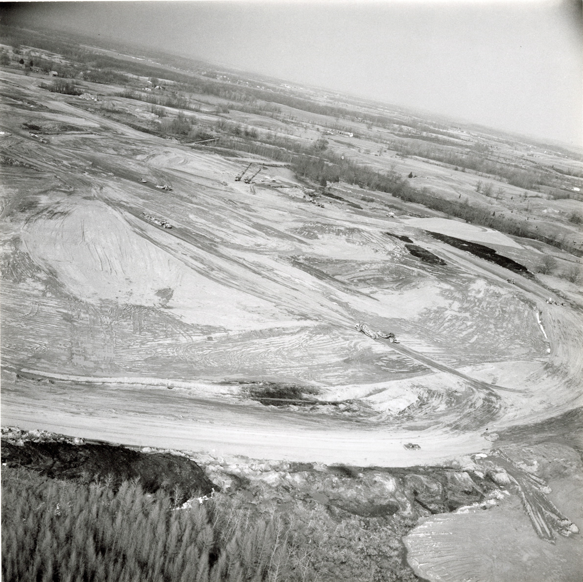 Bird's-eye view of the site for the Michigan International Speedway in Brooklyn, Michigan. The Speedway was designed by Charles Moneypenny and built by developer Lawrence H. LoPatin.