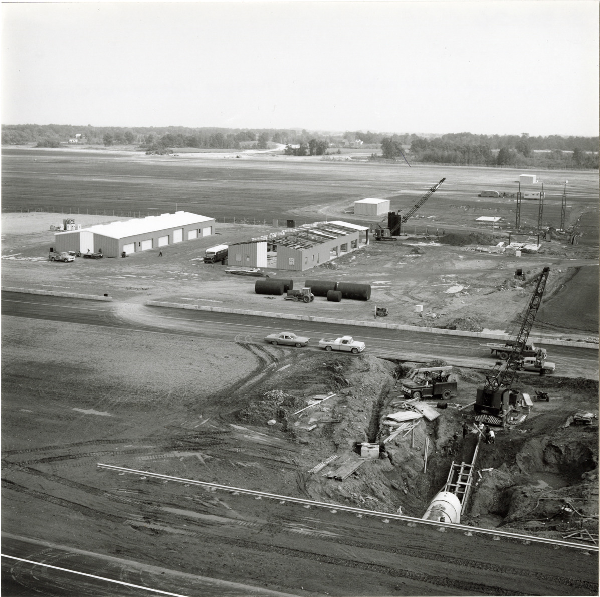 View of the Michigan International Speedway in Brooklyn, Michigan, during construction. Cranes in foreground and background. Two utility buildings, one under construction, in background. The Speedway was designed by Charles Moneypenny and built by developer Lawrence H. LoPatin.
