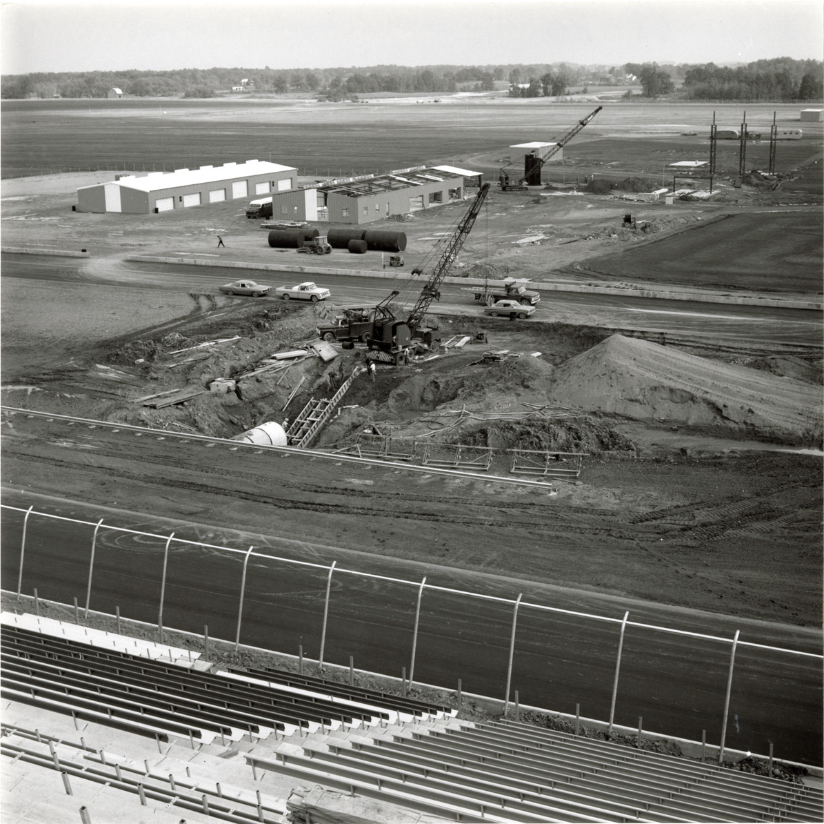 View of the Michigan International Speedway in Brooklyn, Michigan, during construction. Cranes in foreground and background. Two utility buildings, one under construction, in background. The Speedway was designed by Charles Moneypenny and built by developer Lawrence H. LoPatin.