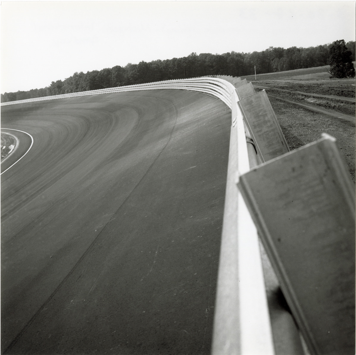 Close-up view of the racetrack and barrier for the Michigan International Speedway in Brooklyn, Michigan, during construction. The Speedway was designed by Charles Moneypenny and built by developer Lawrence H. LoPatin.