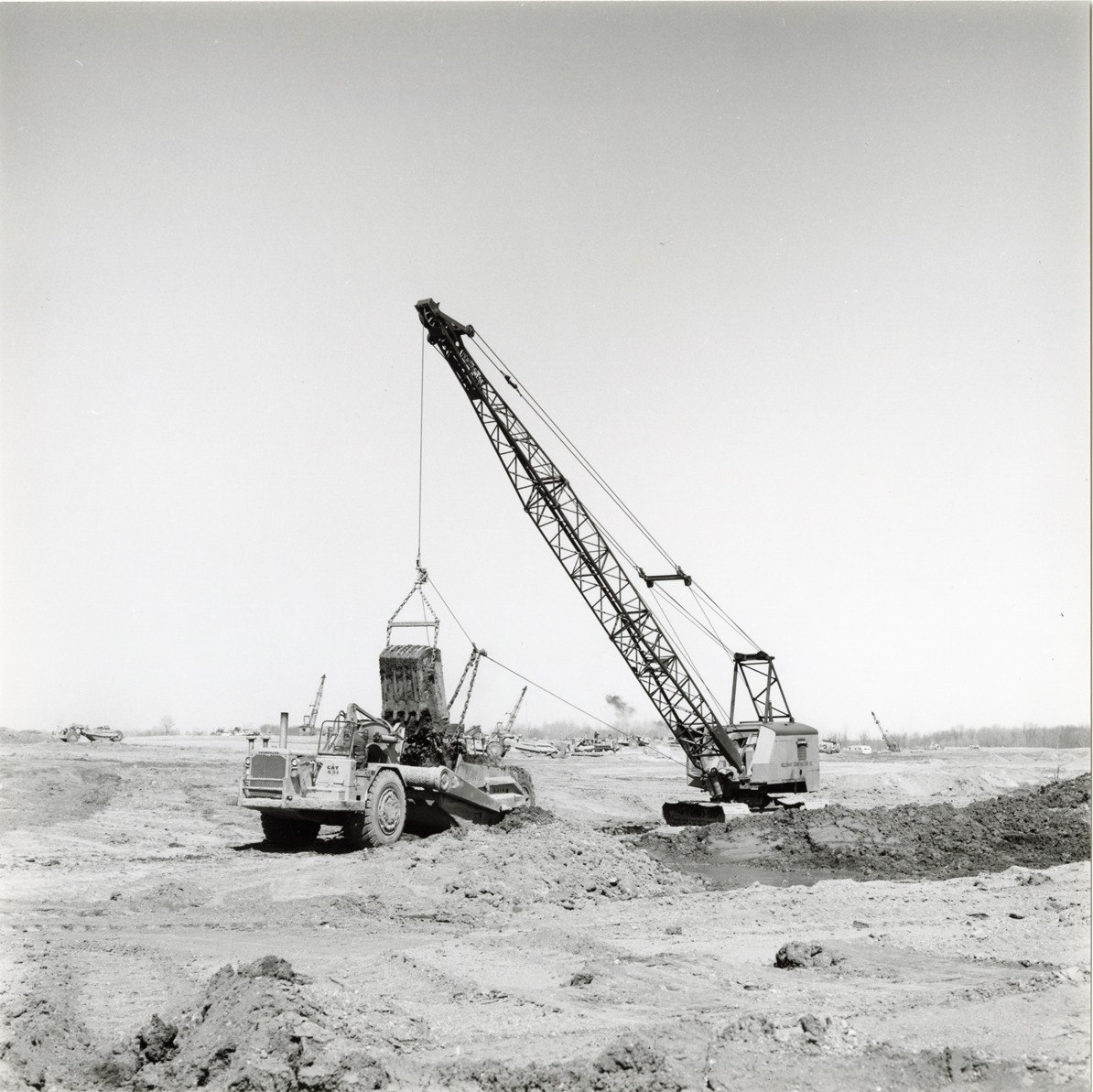 View of crane and bulldozer on the site of the Michigan International Speedway in Brooklyn, Michigan, during construction. The Speedway was designed by Charles Moneypenny and built by developer Lawrence H. LoPatin.