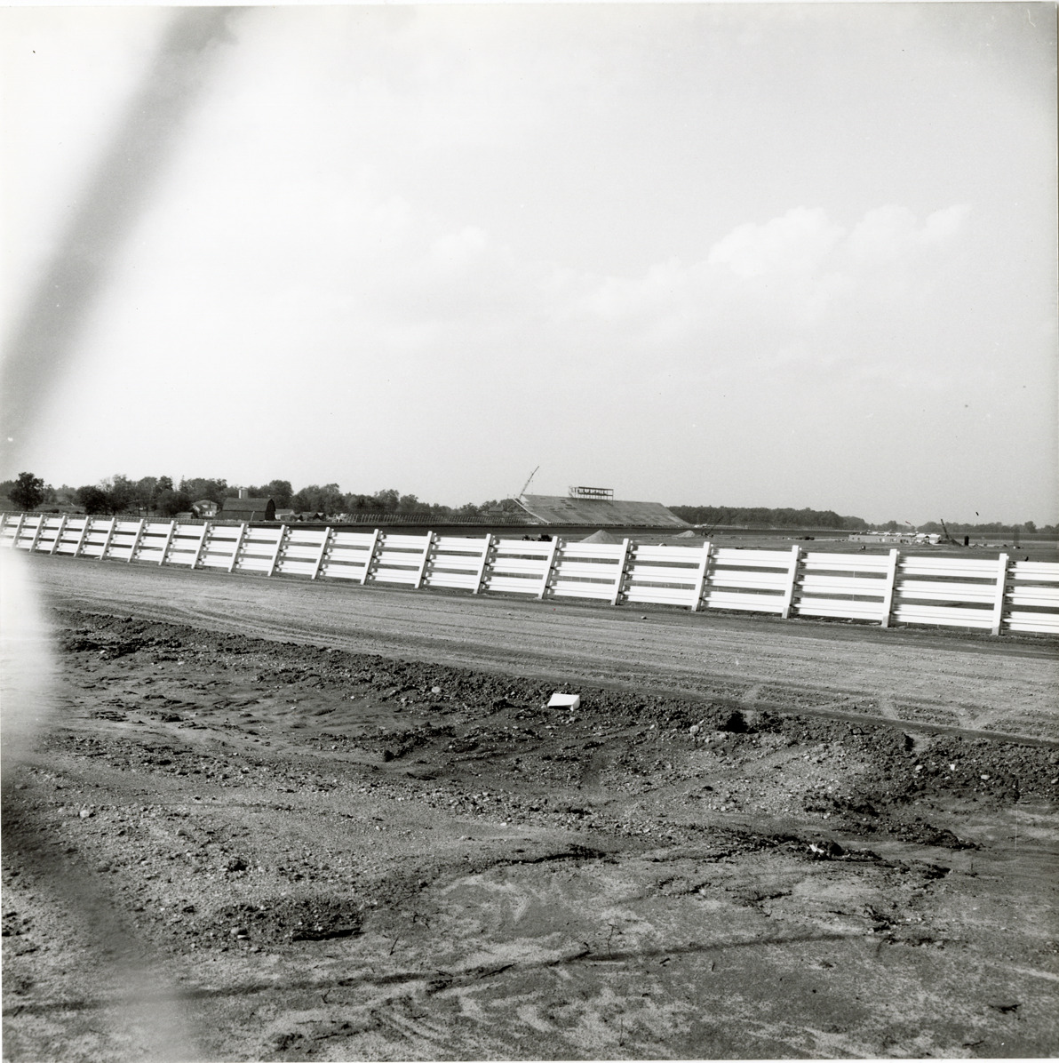 View of racetrack barrier for the Michigan International Speedway in Brooklyn, Michigan, during construction. The Speedway was designed by Charles Moneypenny and built by developer Lawrence H. LoPatin.