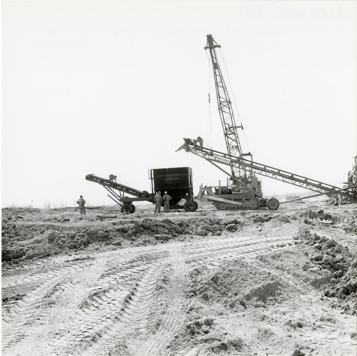 View of bulldozer, crane and machinery excavating site for the Michigan International Speedway in Brooklyn, Michigan. The Speedway was designed by Charles Moneypenny and built by developer Lawrence H. LoPatin.