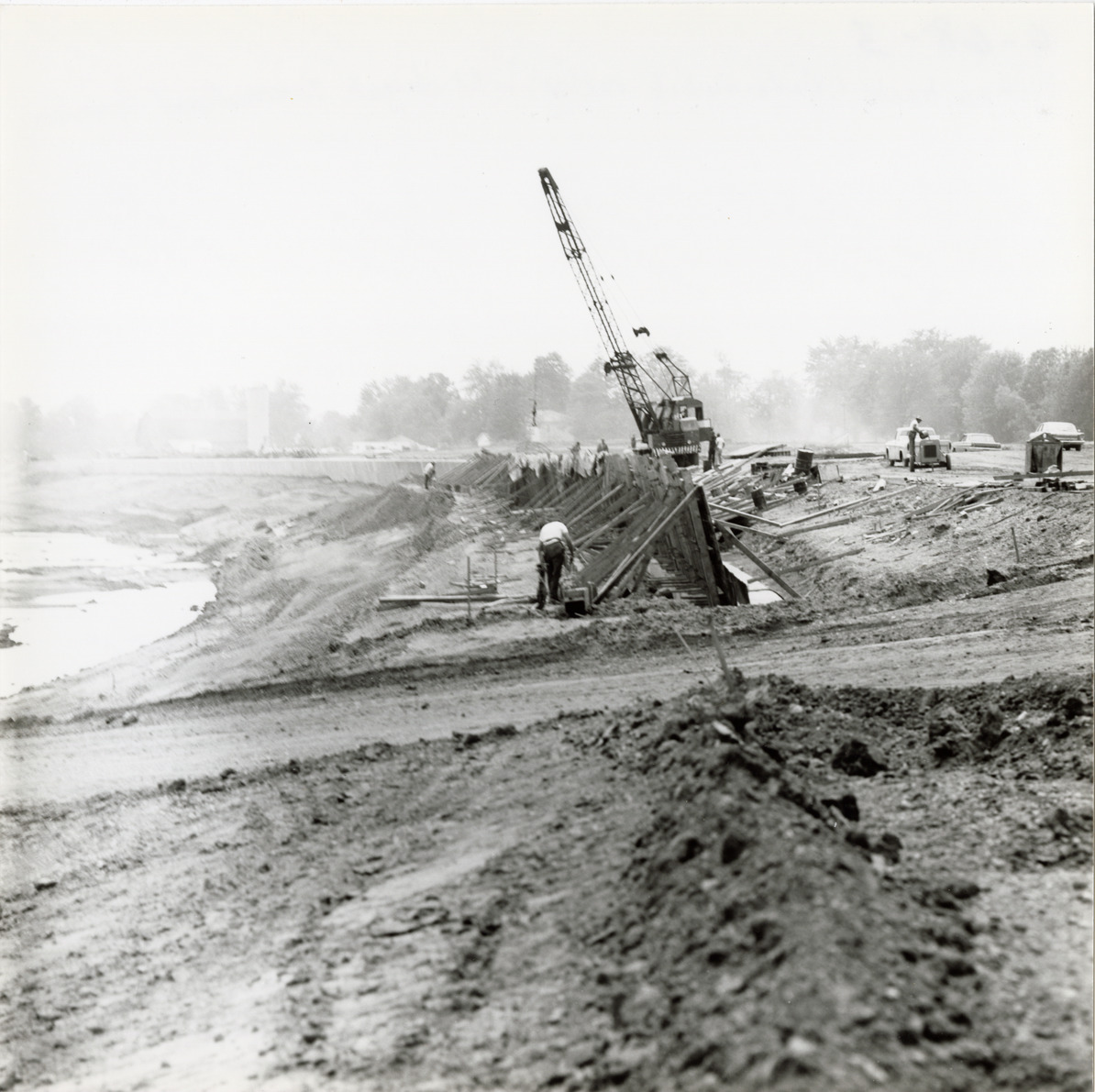 View of workers constructing a concrete embankment wall for the Michigan International Speedway in Brooklyn, Michigan. Crane in background. The Speedway was designed by Charles Moneypenny and built by developer Lawrence H. LoPatin.