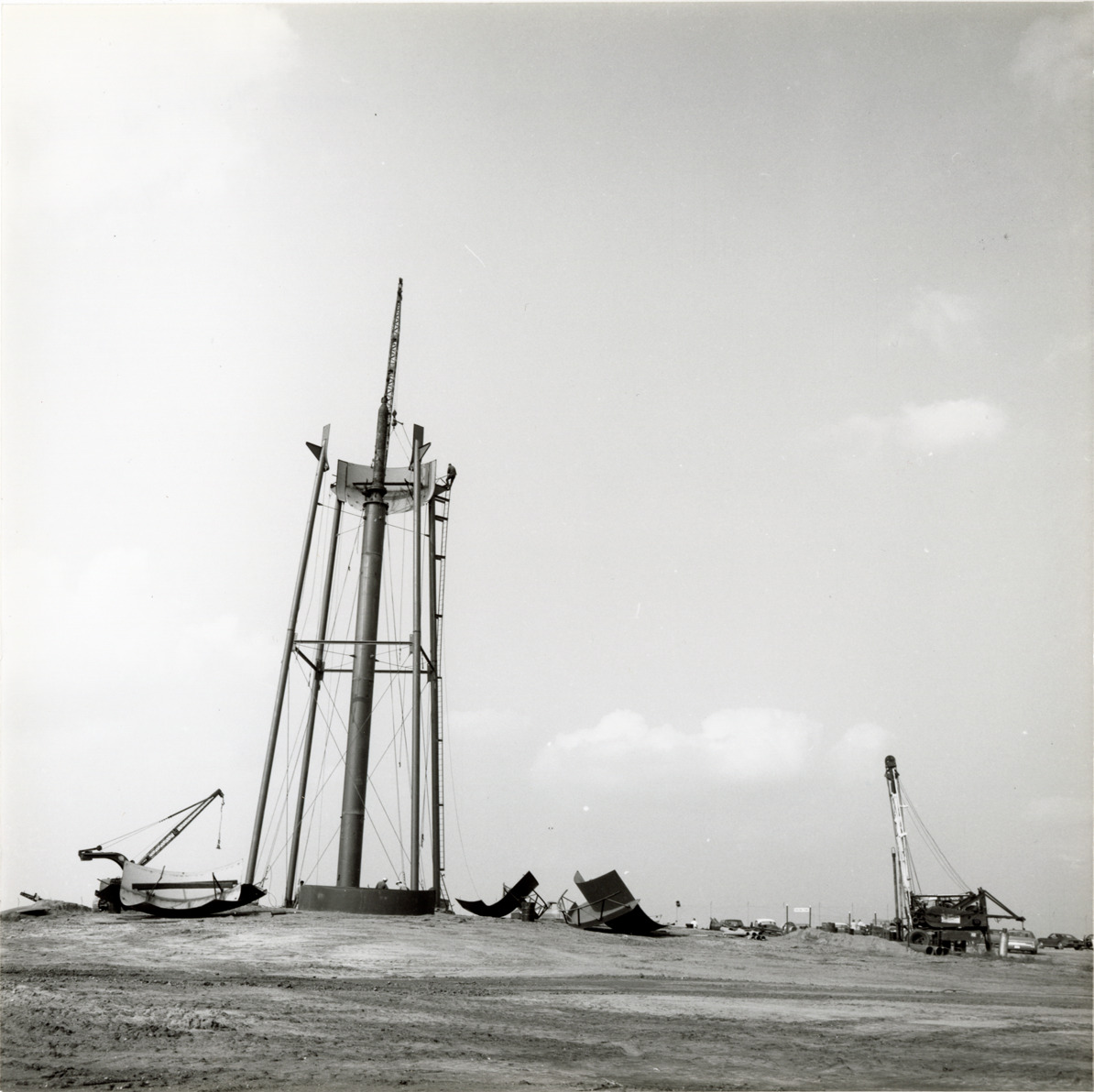 View of a water tower under construction for the Michigan International Speedway in Brooklyn, Michigan. The Speedway was designed by Charles Moneypenny and built by developer Lawrence H. LoPatin.
