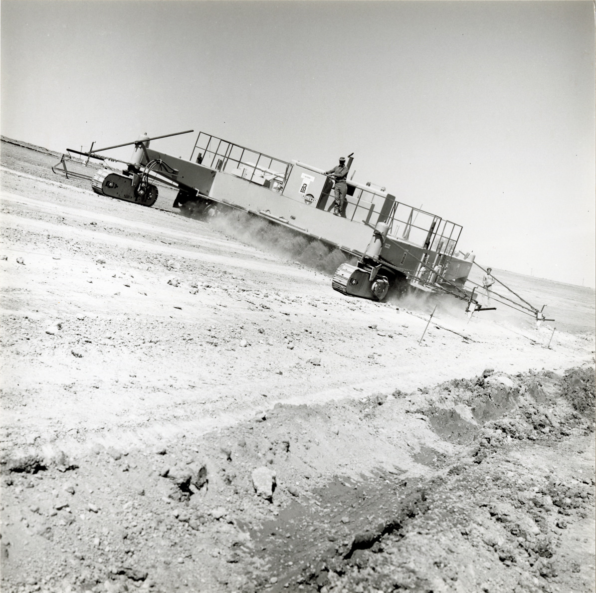 View of a worker operating a grading machine at the Michigan International Speedway in Brooklyn, Michigan, during construction. The Speedway was designed by Charles Moneypenny and built by developer Lawrence H. LoPatin.