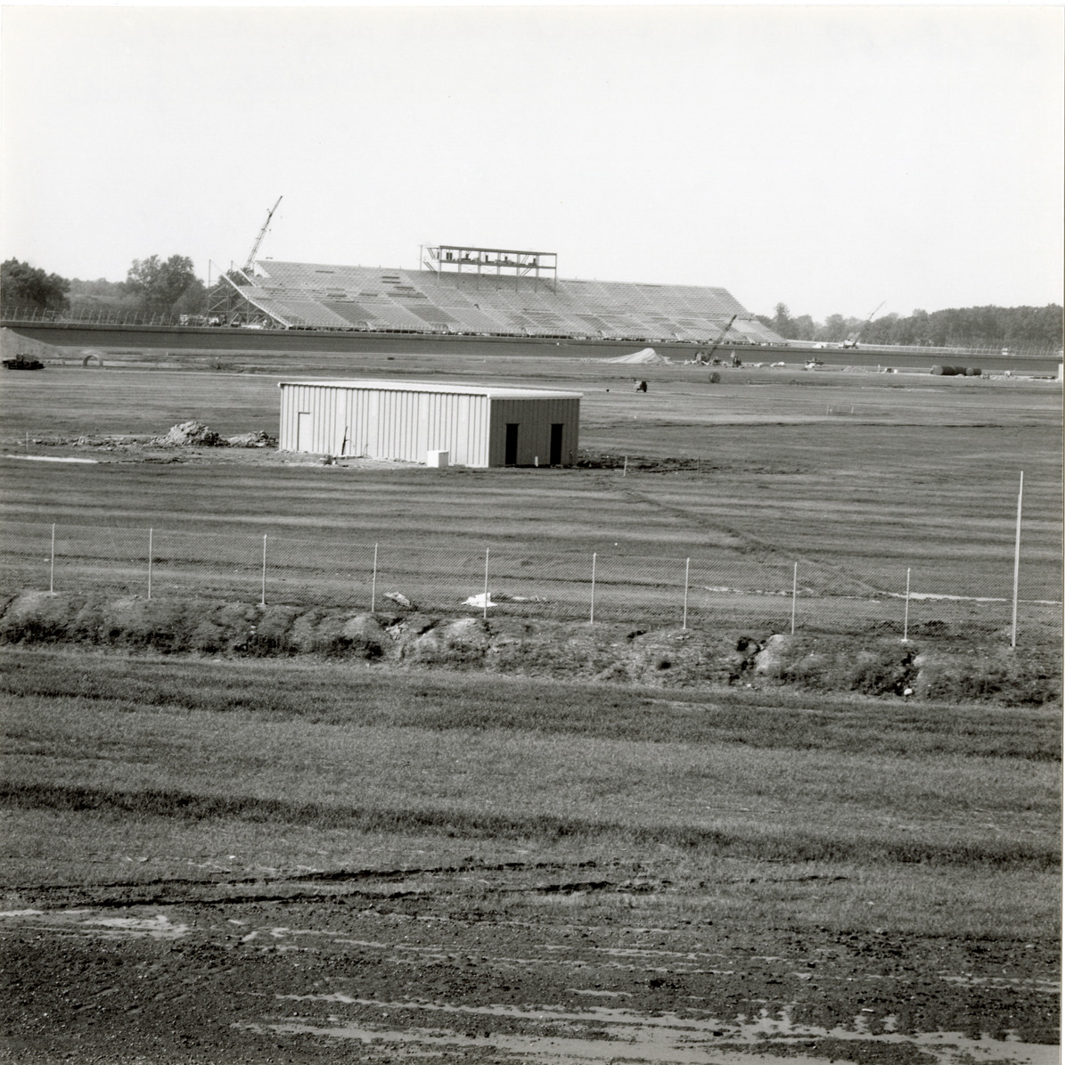 View of a utility building and grandstand for the Michigan International Speedway in Brooklyn, Michigan, during construction. The Speedway was designed by Charles Moneypenny and built by developer Lawrence H. LoPatin.