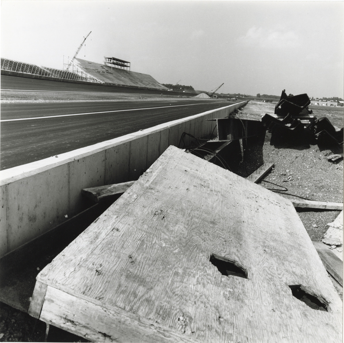 View of the racetrack and grandstand for the Michigan International Speedway in Brooklyn, Michigan, during construction. Construction materials in foreground. The Speedway was designed by Charles Moneypenny and built by developer Lawrence H. LoPatin.