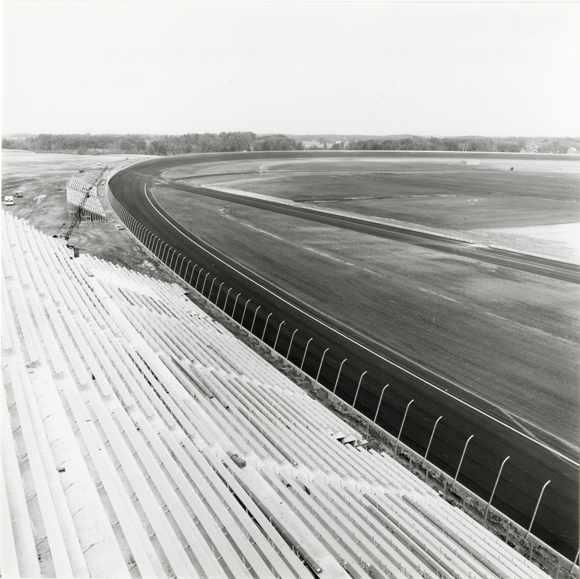 View of the racetrack for the Michigan International Speedway in Brooklyn, Michigan, during construction. Grandstand is visible on left. The Speedway was designed by Charles Moneypenny and built by developer Lawrence H. LoPatin.