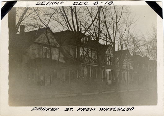 Favorite this☆ Houses on Parker Avenue Description: View of row of wooden-frame houses on Parker Ave., viewed from Waterloo. Handwritten on front: "Detroit. Dec. 8-18. Parker St. from Waterloo." Details Resource ID: bh024690 Subject: Wooden-frame houses--Michigan--Detroit Streets--Michigan--Detroit Photographic prints Date Issued: 1918-12-08 Format: 1 photographic print ; 2.5 x 3.5 in. Member of: Burton Historical Collection Filing Location: D/Streets-Parker Rights: Physical rights are retained by DPL. Copyright is retained in accordance with U.S. copyright laws.