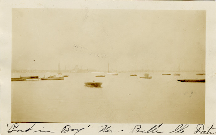 View of boats moored near the shore of Belle Isle. Handwritten on front: "Port in bay, near Belle Ile [sic], Detroit."