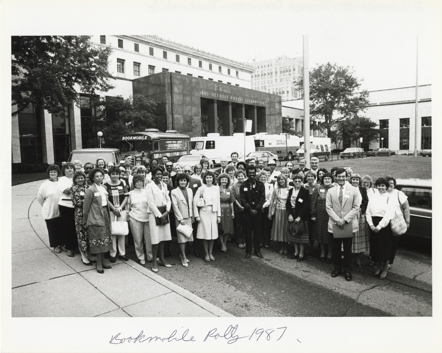 View of librarians and other library employees posing with several bookmobiles at the Cass Ave. entrance. Handwritten on front: "Bookmobile rally, 1987."