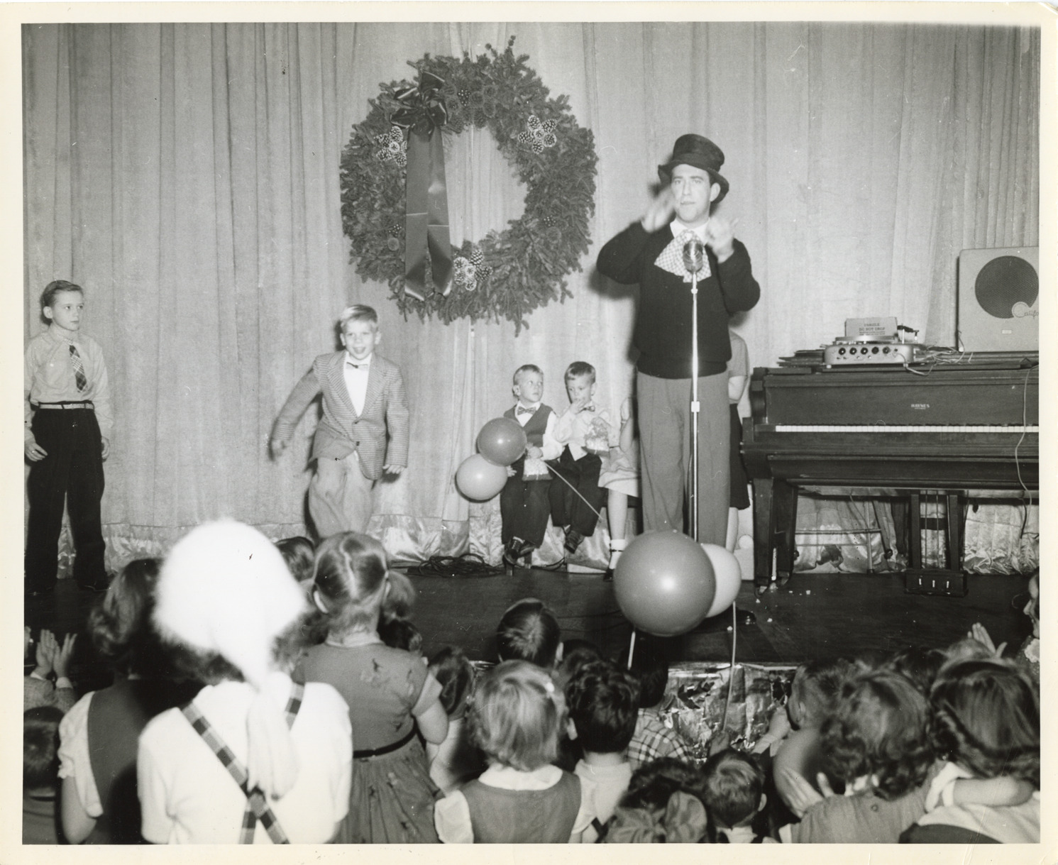 View of television personality Soupy Sales at a microphone during a children's party. Balloons and children in foreground. Piano on right; Christmas wreath displayed on back wall. Stamped on back: "Detroit Police Dept., Central Photo Bureau. Dec. 11, 1955."
