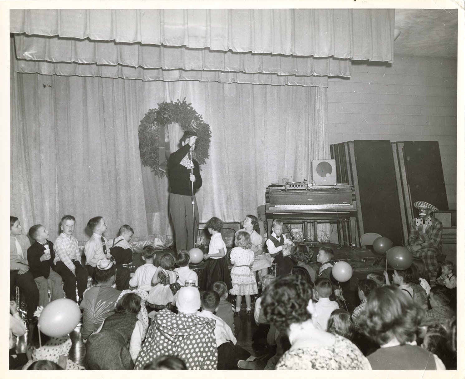 View of television personality Soupy Sales at a microphone during a children's party. Balloons and children in foreground. Piano on right; Christmas wreath displayed on back wall. Stamped on back: "Detroit Police Dept., Central Photo Bureau. Dec. 11, 1955."