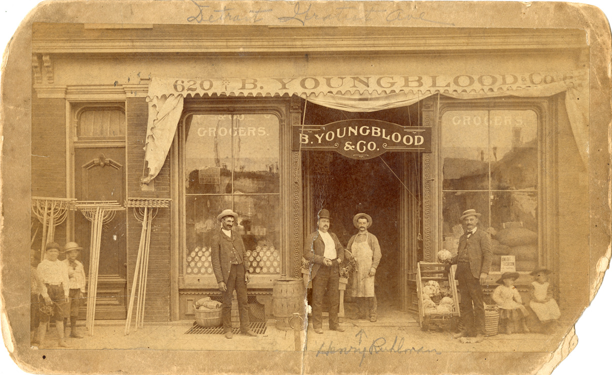 View of four men, one identified as Henry Ruhlman, posing in front of B. Youngblood & Co. grocery store. "620 B. Youngblood Co." is lettered on awning. Two girls on right; three boys on left. Rakes lean against building. Handwritten on front: "Detroit, Gratiot Ave. Henry Ruhlman." Printed on back: "Fowler & Slater, photographers' supplies. Amateur outfits from $6 upwards. 208 Superior Street, Cleveland, Ohio."