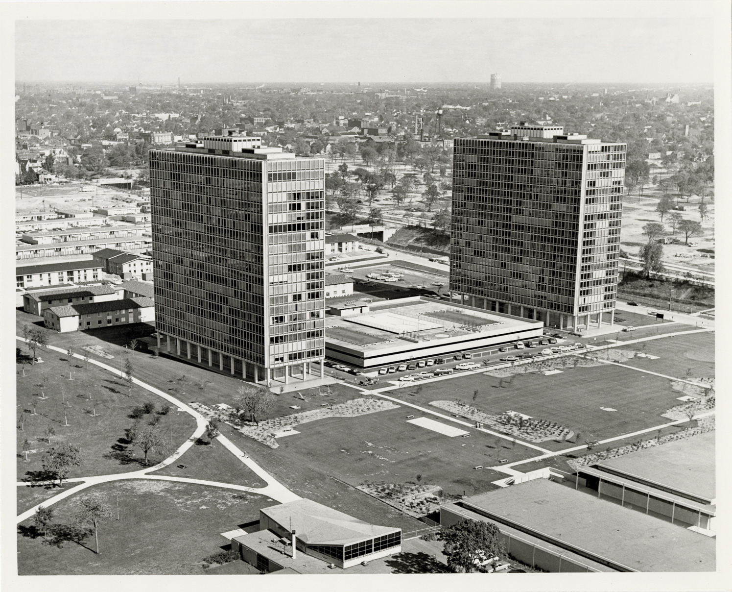 View of the Lafayette Towers East and West apartment buildings, designed by Mies van der Rohe as part of the Lafayette Park development in Detroit. Stamped on back: "City of Detroit photo. Dept. Report & Information. 1008 City County Bldg., Detroit, Michigan 48226." Handwritten on back: "Lafayette Towers (East & West)."
