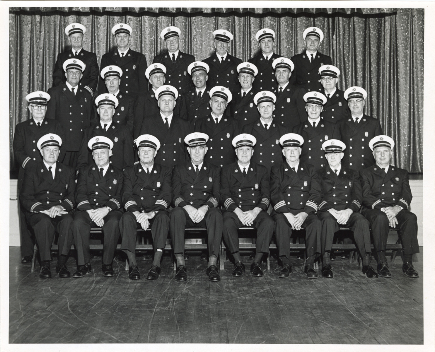 Group portrait of fire chiefs on the 1965 Board of Chiefs, Detroit Fire Department. Label attached to photograph: "Board of Chiefs, July 1, 1965. First row (l. to r.) Edgar Wynsberghe, George C. Ebert, James T. Burke, Assistant Fire Chief; Glenn E. Thom, Chief of Fire Department; Charles J. Quinlan, Deputy Chief of Fire Department; Harvey Rader, Assistant Fire Chief; Harry J. Ballentine, John S. Babbish. Second row (l. to r.) Wilfred J. Kronner, James T.J. Burke, Joseph V. Missel, Raymond Schlage, Victor Jacobsen, William G. Garner, Edward J. Buechel. Third row (l. to r.) John J. Nossal, Edward G. O'Shea, John Butterer, Eugene T. Platt, Roderick J. Paige, Joseph J. Deneweth, George R. Eastcott. Fourth row (l. to r.) Henry G. Faber, James W. McGrath, Warren J. Stanton, Harold W. Powers, John Kubat, Fred Nazar. Chiefs not appearing in above photo: Mario J. Brusatori, Irven A. Gurnack, Victor P. Reuter, Arthur W. Seymour, Roland C. McFadden, Frederick A. Davis, Valerio M. Gerometta, Myron A. Beauvais, Lester P. Emery, Frank D. Vuichard." Stamped on back: "Detroit Firemen's Fund Association, Washington Blvd. & Larned. Detroit 26, Mich."