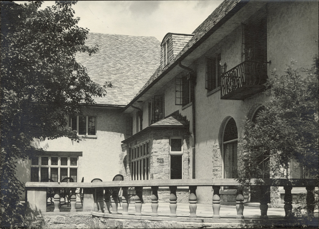 Favorite this☆ Patio, Adams Castle, Bloomfield Hills, Michigan Description: View of the patio of Adams Castle, located on 900 Adams Castle Dr. in Bloomfield Hills, Michigan. Table and chairs are visible behind stone balustrade. Adams Castle was built in 1927, designed by architect Richard Marr. Details Resource ID: bh024765 Subject: Castles--Michigan--Bloomfield Hills Patios--Michigan--Bloomfield Hills Architecture, Tudor--Michigan--Bloomfield Hills Marr, Richard, 1886-1946 Photographic prints Date Issued: 1950 (year approximate) Format: 1 photographic print mounted on stock ; image 5 x 7 in. Member of: Burton Historical Collection Filing Location: M/Localities--Bloomfield Hills--Historic houses--Adams Castle Note (Content): bh024766 on verso. Rights: Physical rights are retained by DPL. Copyright is retained in accordance with U.S. copyright laws.