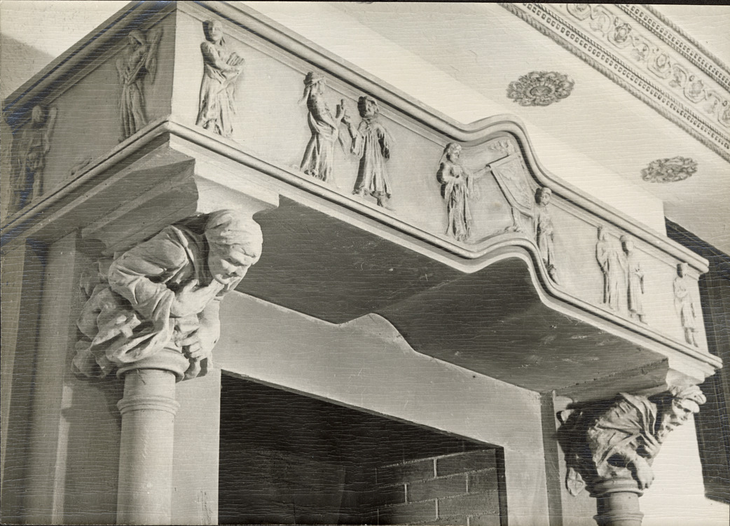 Close-up view of fireplace with frieze and decorative pilasters at Adams Castle, located on 900 Adams Castle Dr. in Bloomfield Hills, Michigan. Adams Castle was built in 1927, designed by architect Richard Marr.
