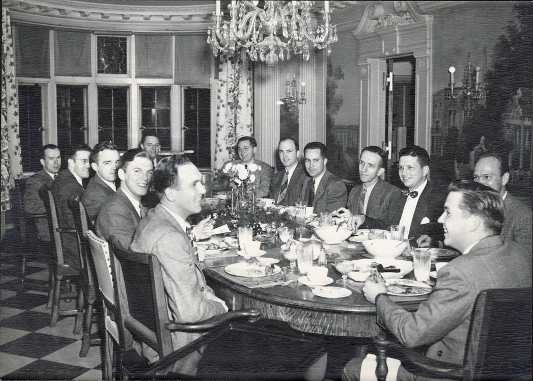 View of a group of men posing around dining room table at Adams Castle, located on 900 Adams Castle Dr. in Bloomfield Hills, Michigan. From 1946-1956, the owners of Adams Castle rented the residence to a group of bachelor architects and engineers. Adams Castle was built in 1927, designed by architect Richard Marr.