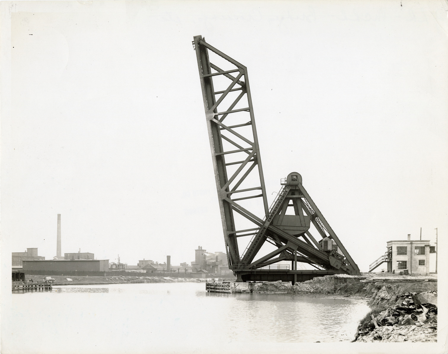 View of the Wabash Railroad bridge over the River Rouge; later known as the Norfolk Southern Railroad bridge. Stamped on back: "American Commercial Photo Co., 25 Parsons St., Glendale 7152, Detroit." Handwritten on back: "River Rouge, looking south."