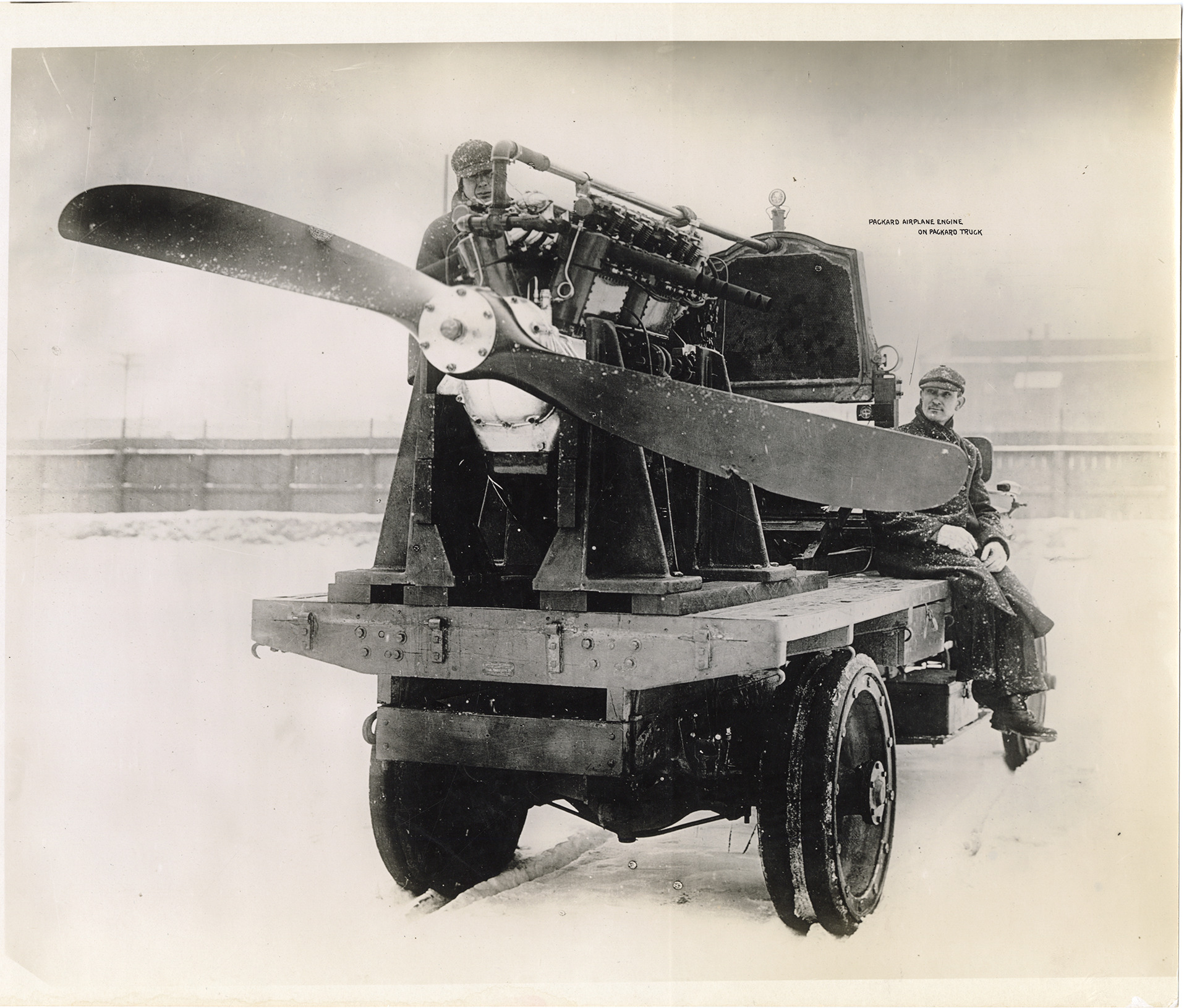 View of two men posing on a Packard truck, powered by a Packard airplane engine and propeller. Printed on front: "Packard airplane engine on Packard truck." Typed on accompanying sheet: "Packard airplane engine with airplane propeller driving a Packard truck through Detroit streets in January, 1917."