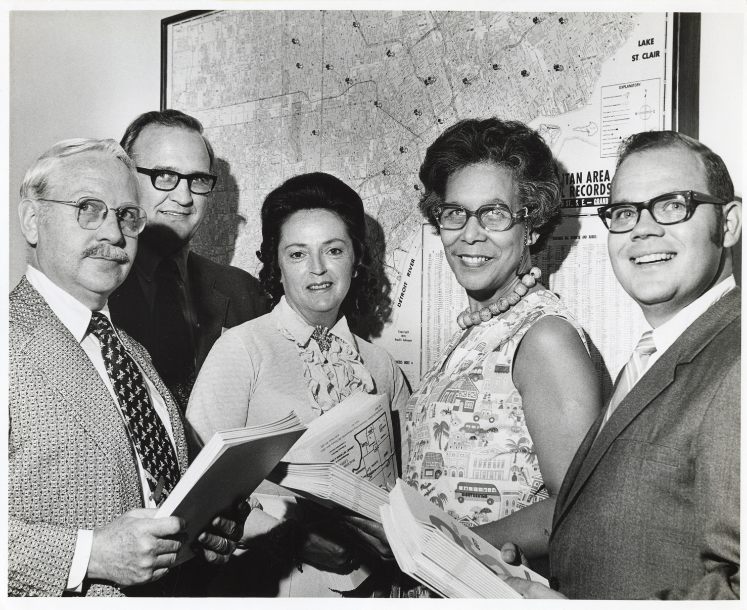 View of Clara Stanton Jones, director of the Detroit Public Library and other librarians posing with copies of catalog for new Public Safety Collection. Label on back: "Cooperating library systems share a new Public Safety Collection. Holding copies of a catalog to the collection which will be made available to police and fire agencies are, left to right: Leo Dinnan, Director, Wayne Oakland Federated Library System; Glenford Leonard, Public Safety Programs Manager, SEMCOG; Mrs. Mary Jane Bravic, representative of William Slemmer, Director, Library Network of Macomb; Mrs. Clara S. Jones, Director, Detroit Associated Libraries System; Lawrence Davenport, Director, Washtenaw Area Library System."