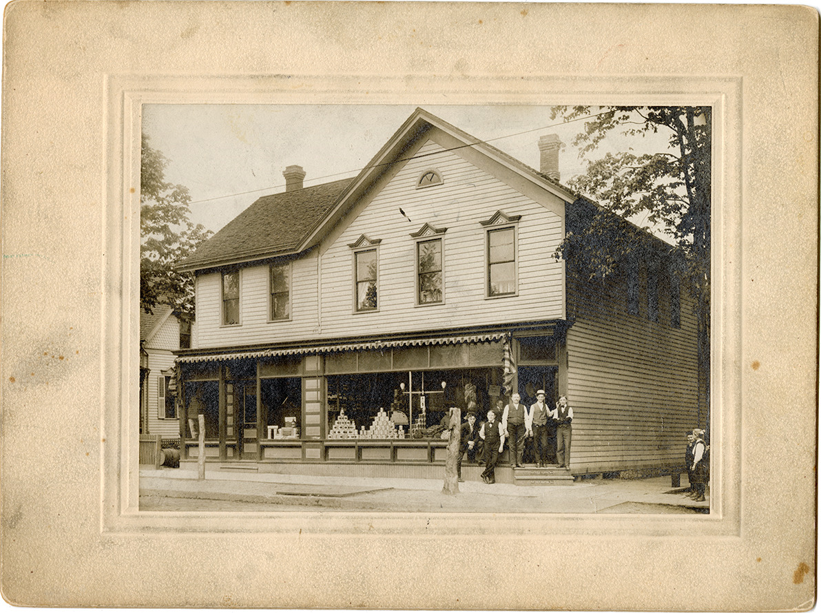 View of several men posing outside the John F. Behlow grocery store, located at 404 Joseph Campau. Two-story, wooden-frame building with awning over display windows. Canned goods are stacked in windows. Label on back: "John F. Behlow owned a grocery store at 404 Joseph Campau from 1900-1918. When John died in 1918, his youngest son Fred made business a dry goods store." Handwritten on back: "John F. Behlow grocery store & candy store on Jos. Campau."