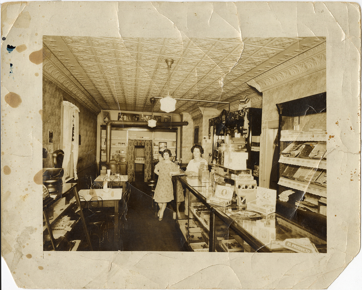 View of two women posing inside the Van Fleet confectionery. Store is furnished with display cases, tables, and chairs. Shelves holding candy and other items are along walls; cigar boxes on counters. Typed on back: "Van Fleets [sic] confectionary [sic] store, 8072 W. Fort St., Detroit, Michigan."