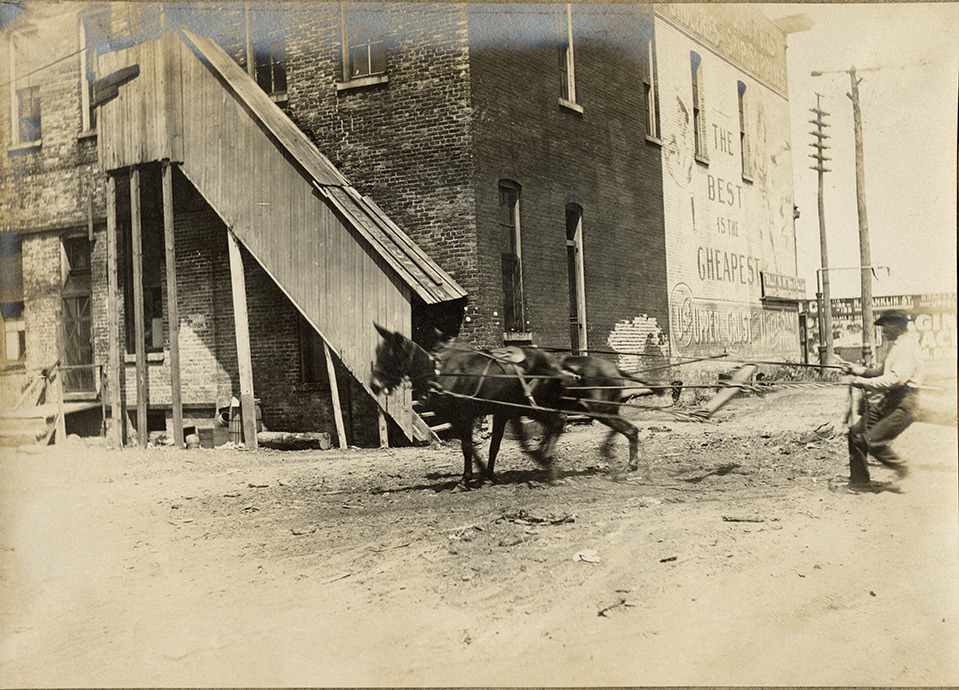 Favorite this☆ Man holding two horses by reins after flood, Saginaw, Michigan Description: View of a man trying to control two horses in town after the 1904 flood in Saginaw, Michigan. Brick building with wooden staircase in background. Brick wall sign on right. Details Resource ID: bh024839 Subject: Floods--Michigan--Saginaw Flood damage--Michigan--Saginaw Horses--Michigan--Saginaw Staircases--Michigan--Saginaw Photographic prints Date Issued: 1904 Format: 1 photographic print mounted on stock ; image 4.5 x 6.5 in. Member of: Burton Historical Collection Filing Location: M/Localities-Saginaw-Flood, 1904 Note (Content): Part of an album of 18 photographs, depicting the aftermath of the "Great Flood of Saginaw" in 1904. Rights: Physical rights are retained by DPL. Copyright is retained in accordance with U.S. copyright laws.