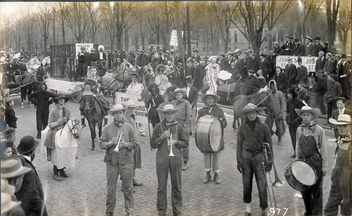View of students participating in a parade for the University of Michigan Triennial County Fair in Ann Arbor, Michigan. Students, costumed in overalls and wide-brimmed hats, pose with bugles, trombone and drums. Young man wearing horse costume on left. Clown on horseback, float with animal cage, judges' stand and spectators in background. These fairs were held every three years by the Michigan Union, a male-only organization, although fifty different student organizations participated. Funds raised were intended to construct a clubhouse for the Union.
